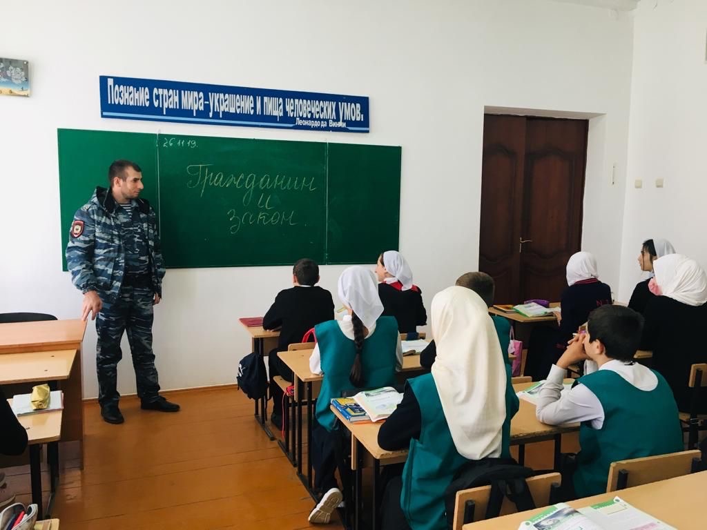 27.11.2019г. в целях профилактики преступлений и правонарушений среди несовершеннолетних, а также повышения эффективности работы по изучению учащимися правил безопасного поведения на дорогах и воспитания законопослушных сознательных участников дорожного движения инспектор ПДН Абдуев М.З. провёл беседы с обучающимися 8-х классов на тему «Гражданин и закон». В мероприятии приняли участие члены отряда ЮДП. Также он обсудил с ребятами вопросы безопасности дорожного движения. Ребята активно отвечали заданные им вопросы в ходе беседы.