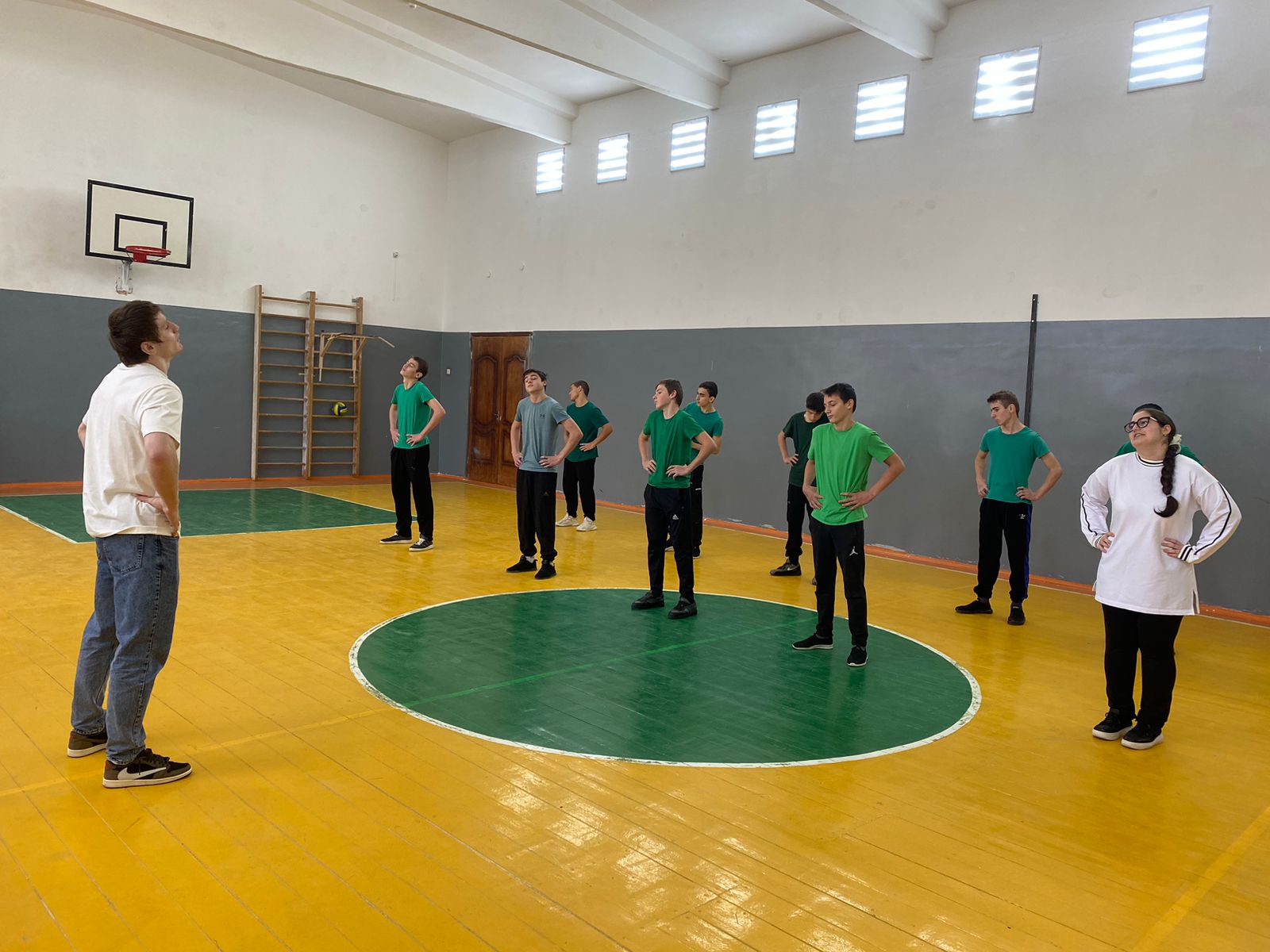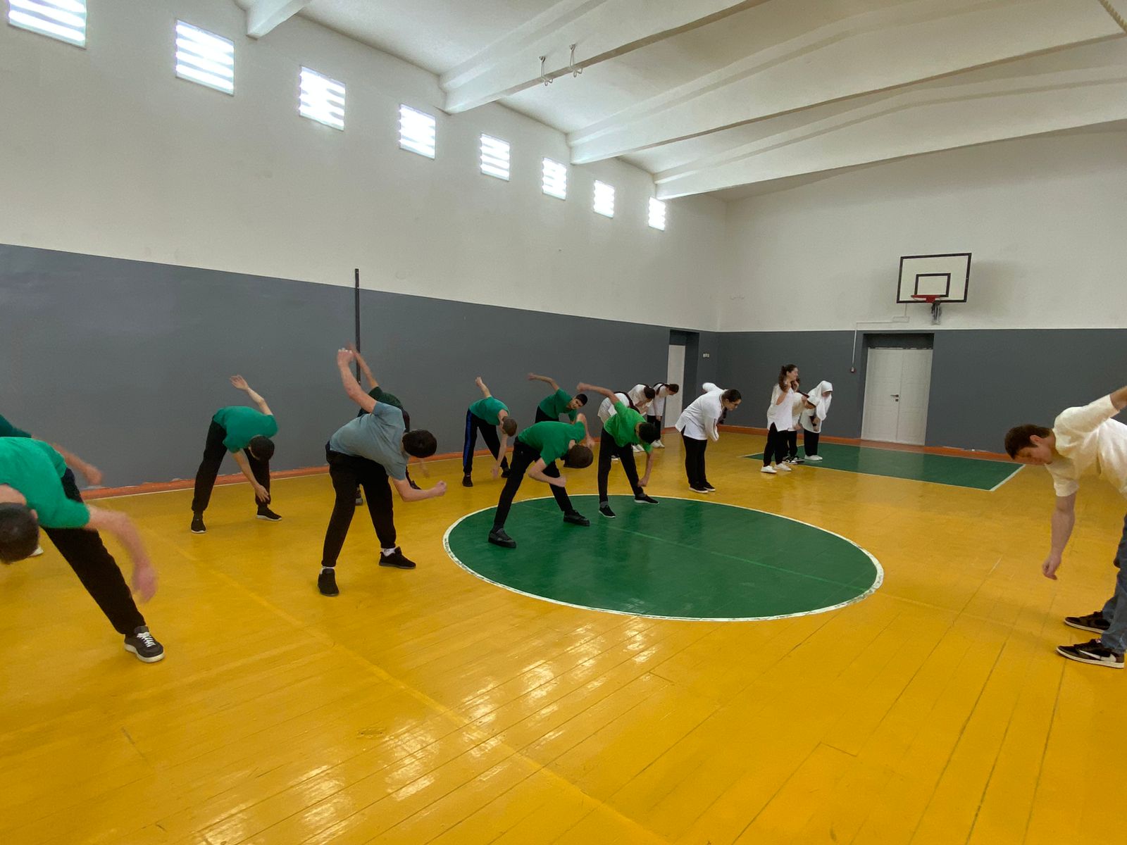 На зарядку вышли учащиеся 8-х классов. Мероприятие провел Алиев Имран Исмаилович, который является заслуженным мастером спорта, чемпионом Мира и Европы по греко-римской борьбе.