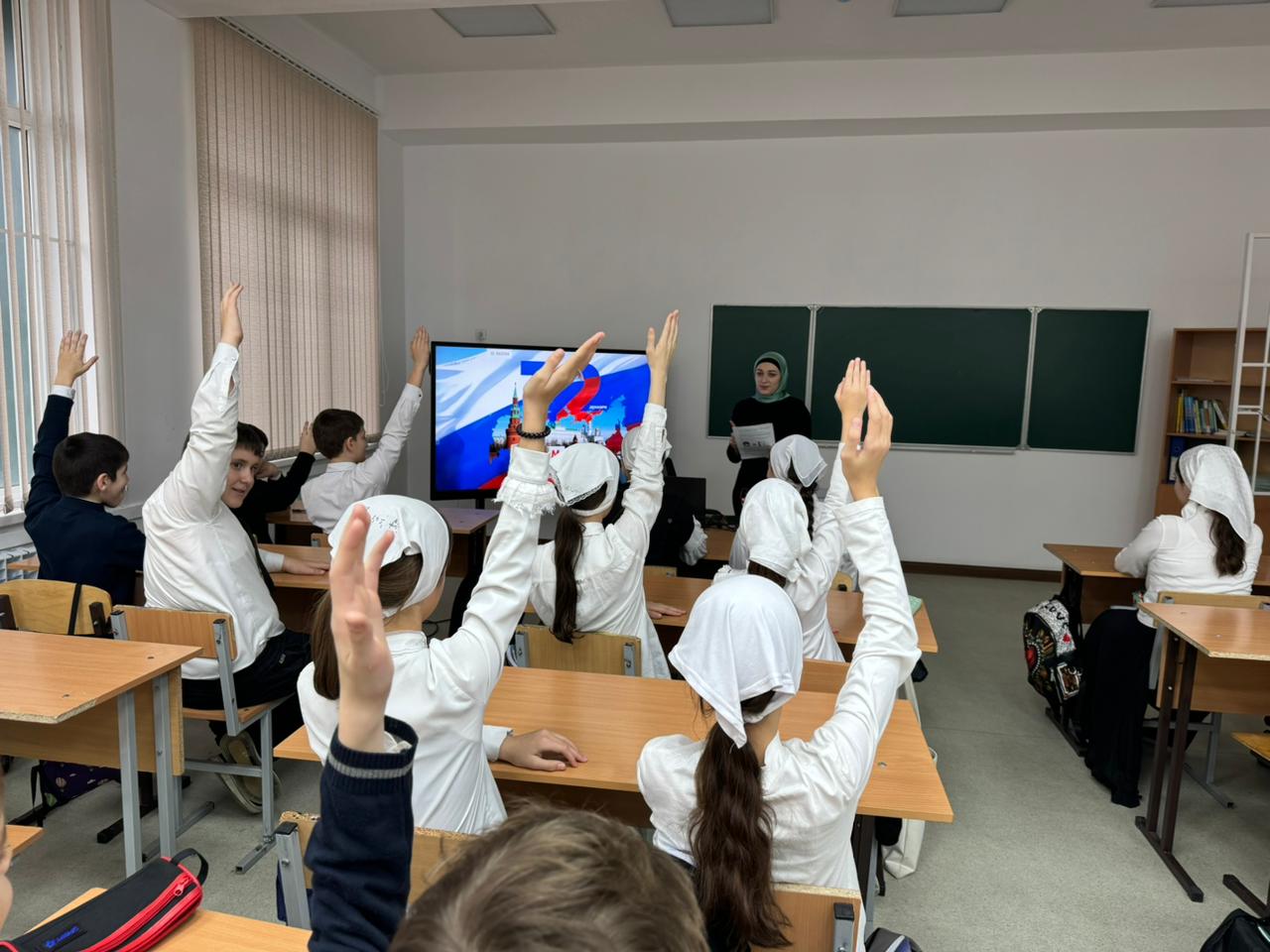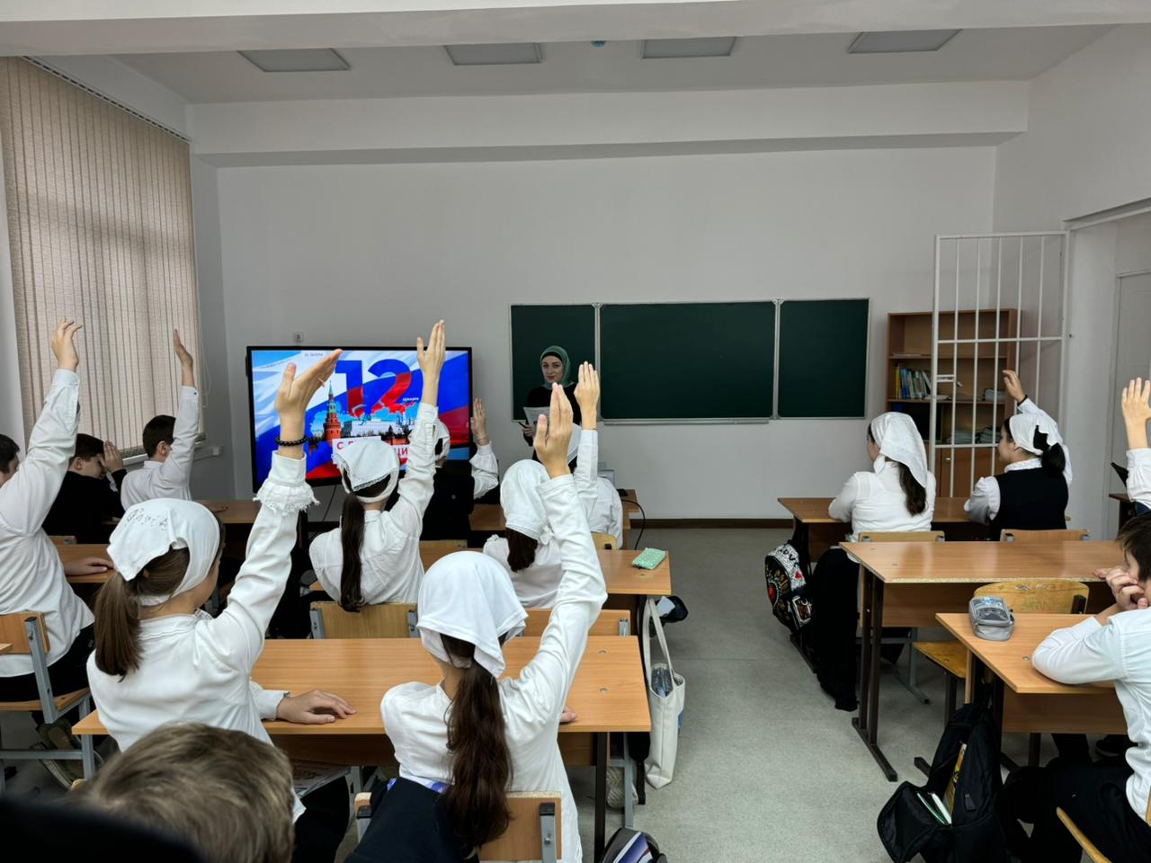 В рамках Года педагога и наставника 11.12.2023 г. в МБОУ «Наурская СОШ №3» учитель математики Хамидова М.М. в 5 «А» классе провела классный час на тему «День Конституции РФ».#ГПН-2023#